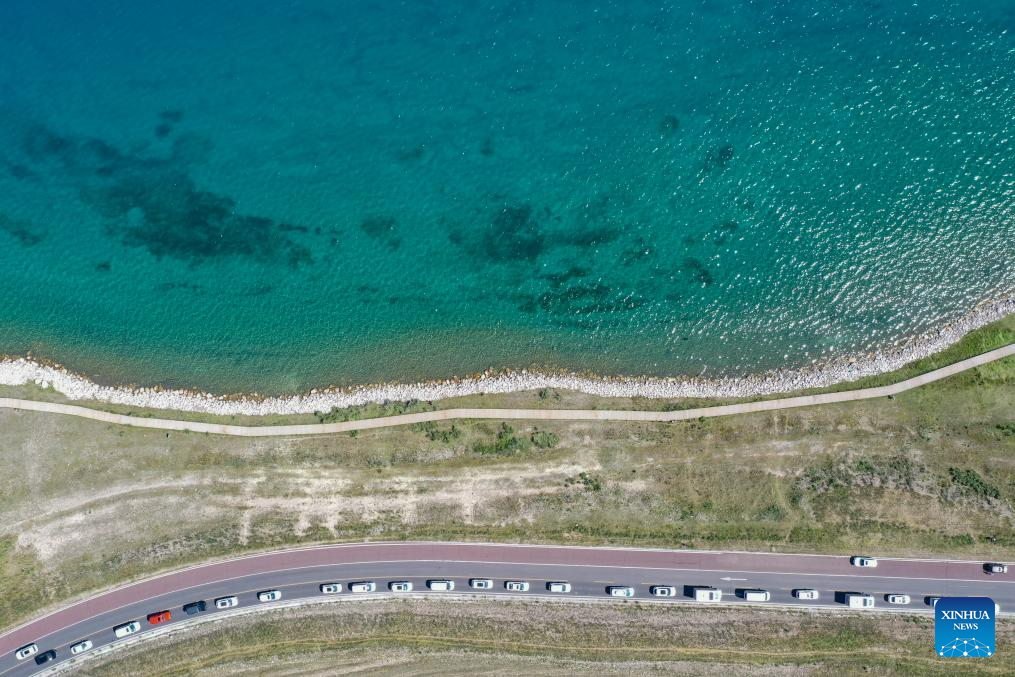 This aerial photo taken on July 25, 2023 shows vehicles waiting to enter the Sayram Lake scenic area in Bortala Mongolian Autonomous Prefecture, northwest China's Xinjiang Uygur Autonomous Region. (Xinhua/Ding Lei)