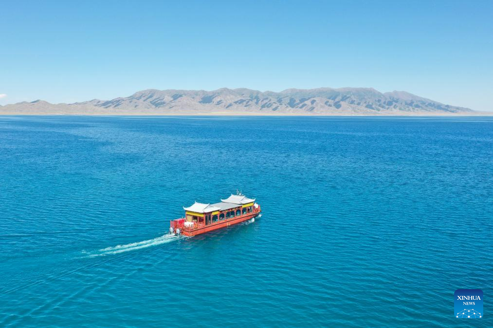 Tourists visit Sayram Lake by boat in Bortala Mongolian Autonomous Prefecture, northwest China's Xinjiang Uygur Autonomous Region, July 25, 2023. (Xinhua/Ding Lei)