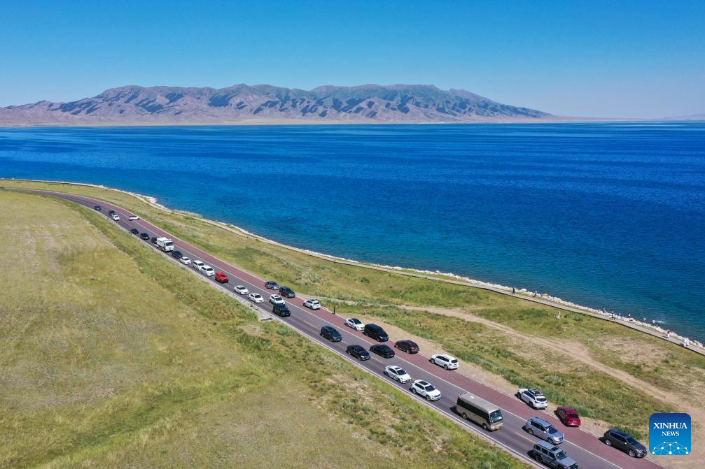 Tourists visit Sayram Lake in Bortala Mongolian Autonomous Prefecture, northwest China's Xinjiang Uygur Autonomous Region, July 25, 2023. (Xinhua/Ding Lei)