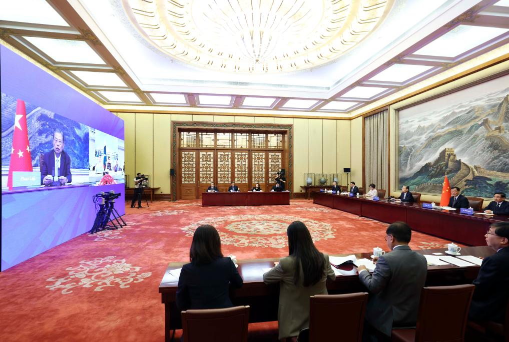 Zhao Leji, chairman of the National People's Congress (NPC) Standing Committee, holds talks with the Speaker of Pakistan's National Assembly Raja Pervaiz Ashraf via video link at the Great Hall of the People in Beijing, capital of China, July 25, 2023. (Xinhua/Liu Weibing)