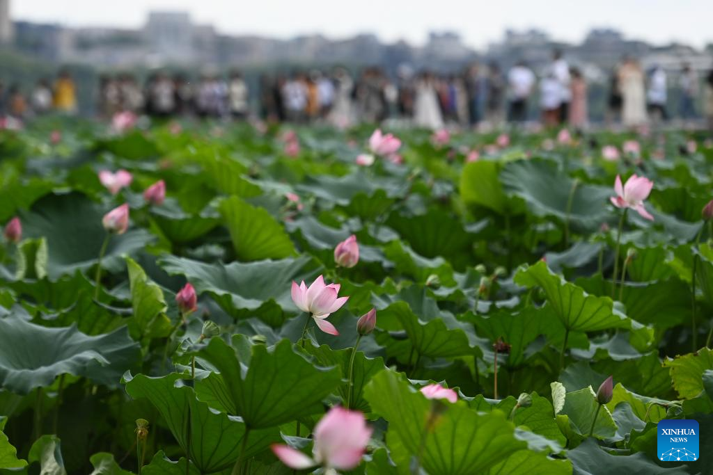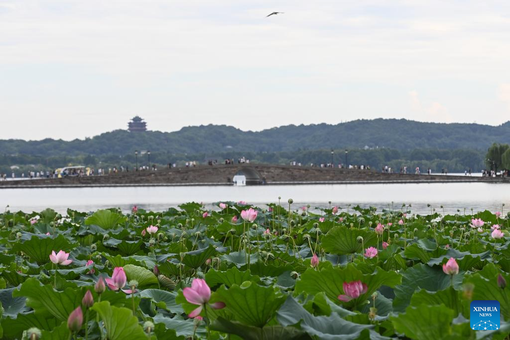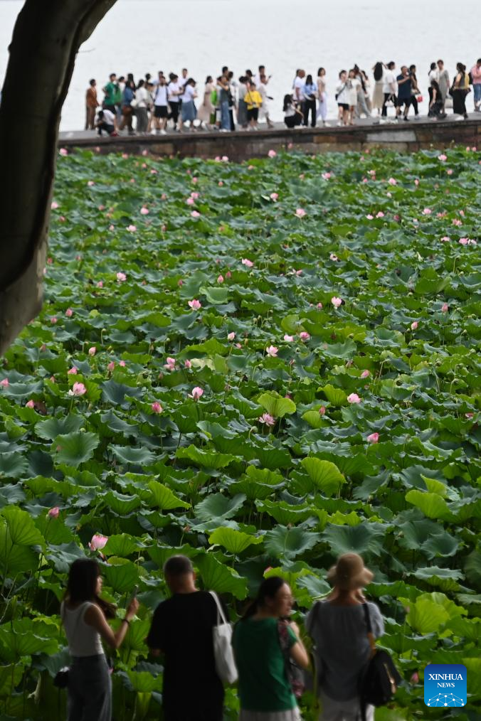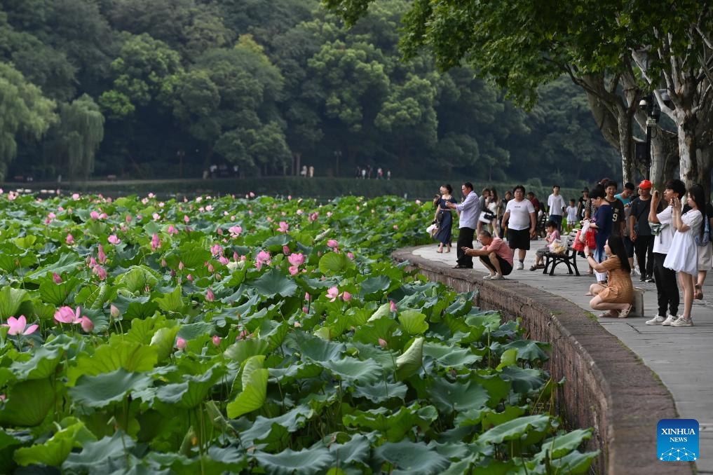 Tourists enjoy lotus flowers in the West Lake scenic area in Hangzhou, capital of east China's Zhejiang Province, July 25, 2023. In summer, the blossoming lotus flowers are a must-see for visitors to Hangzhou's West Lake. (Xinhua/Huang Zongzhi)