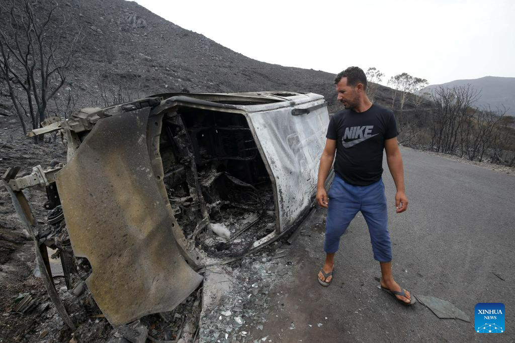 A man inspects a vehicle burned in a wildfire in Bejaia Province, Algeria, on July 25, 2023. The death toll from wildfires in northern Algeria has risen to 34, including 10 soldiers, the Interior Ministry said in an update on Monday. The fires started overnight on Sunday mainly in the provinces of Bejaia, Jijel, and Bouira, but quickly spread due to strong winds, causing significant damage. (Xinhua)
