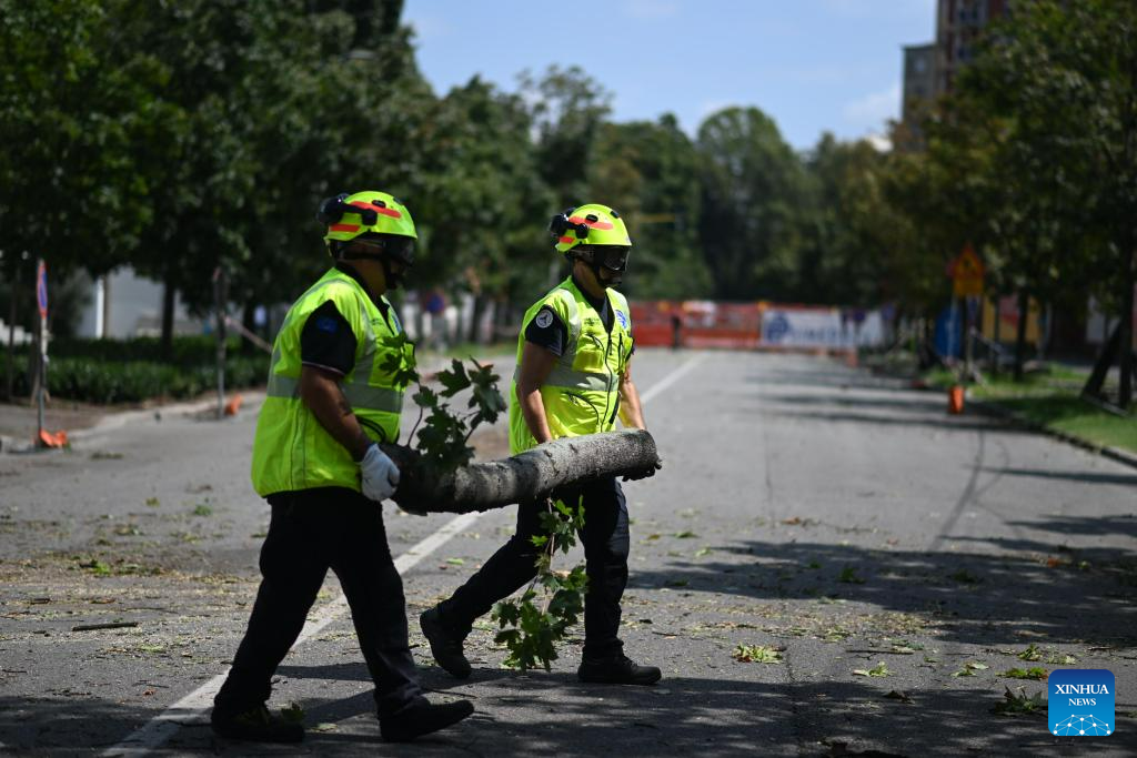 Fallen branches are seen after thunderstorms in Milan, Italy, on July 25, 2023. While the southern two-thirds of Italy struggled under the oppressive heat, most of the northern area was pelted by thunderstorms and over-sized hail. Media reports said the emergency services in Milan had responded to more than 200 requests for help related to flooding, fallen trees, and damage to cars and homes, since a severe storm hit the city late Monday. (Str/Xinhua)