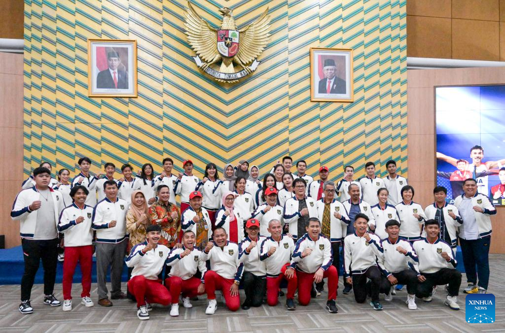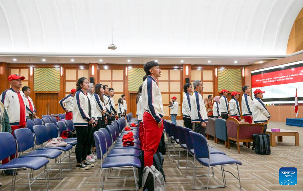 Members of Team Indonesia attend the departure ceremony for the upcoming 31st International University Sports Federation (FISU) Summer World University Games in Jakarta, Indonesia, July 25, 2023. The Universiade will unfold in Chengdu, in southwest China's Sichuan Province, from July 28 through August 8. (Xinhua/Zulkarnain)