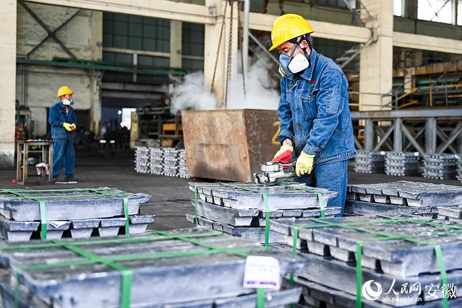 A worker works on lead blocks at Tianying Technology Park in Jieshou, Fuyang, east China's Anhui Province. (People's Daily Online/Miao Zijian)