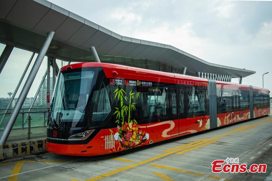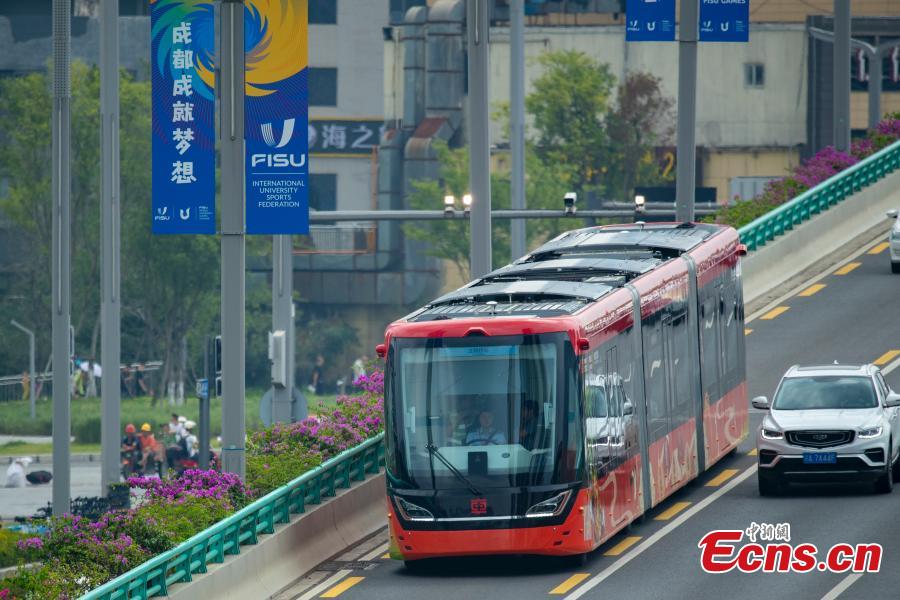 A passenger takes photos of a smart trackless "rail bus" in Chengdu, southwest China's Sichuan Province, July 25, 2023. (Photo: China News Service/Liu Zhongjun)