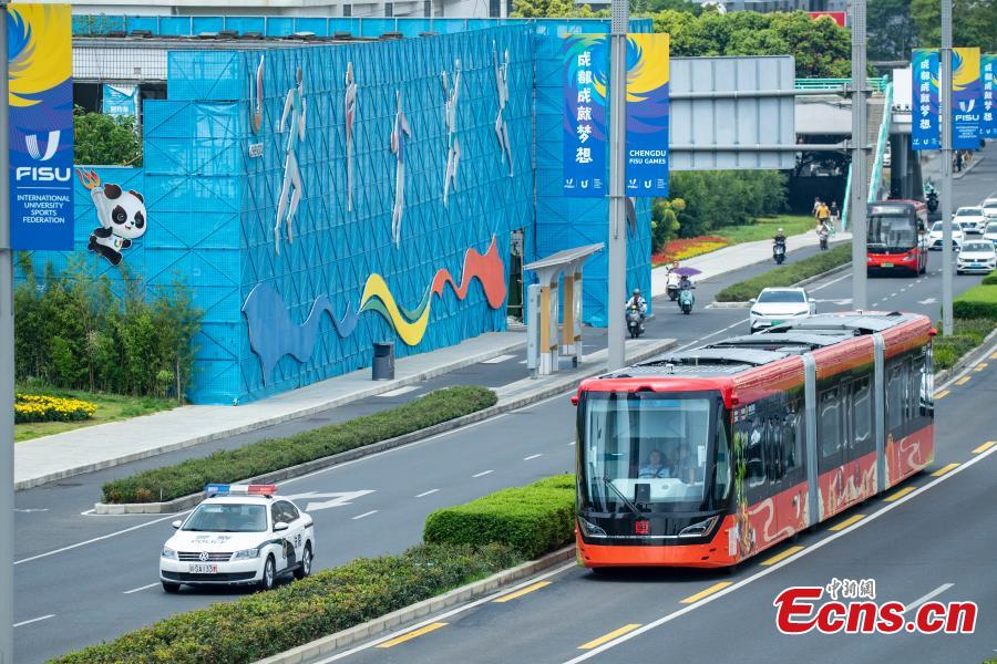 A red smart trackless "rail bus" runs on Bus Rapid Transit Line K7 in Chengdu, southwest China's Sichuan Province, July 25, 2023. (Photo: China News Service/Liu Zhongjun)