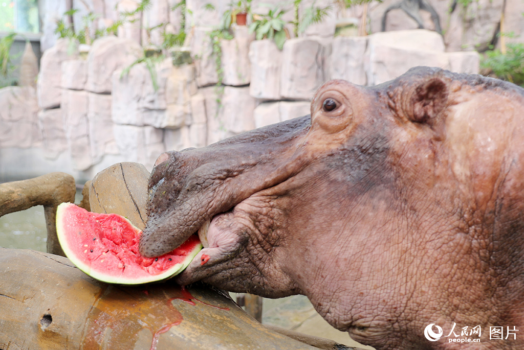 A hippo eats watermelon at Qingdao Forest Wildlife World in Qingdao city, east China's Shandong Province. (Photo/Zhang Jingang)