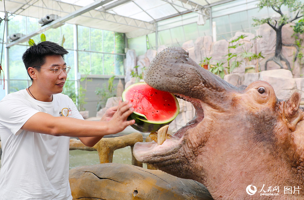 A zoo keeper feeds watermelon to a hippo?at Qingdao Forest Wildlife World in Qingdao city, east China's Shandong Province. (Photo/Zhang Jingang)