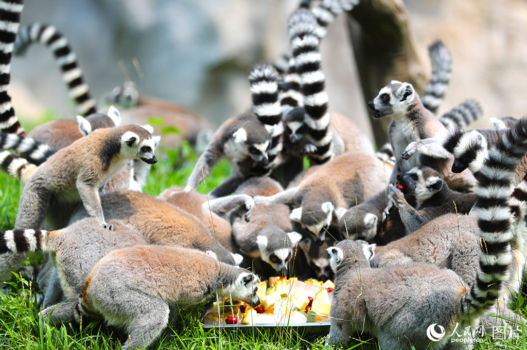 Lemurs east fruits at Qingdao Forest Wildlife World in Qingdao city, east China's Shandong Province. (Photo/Zhang Jingang)