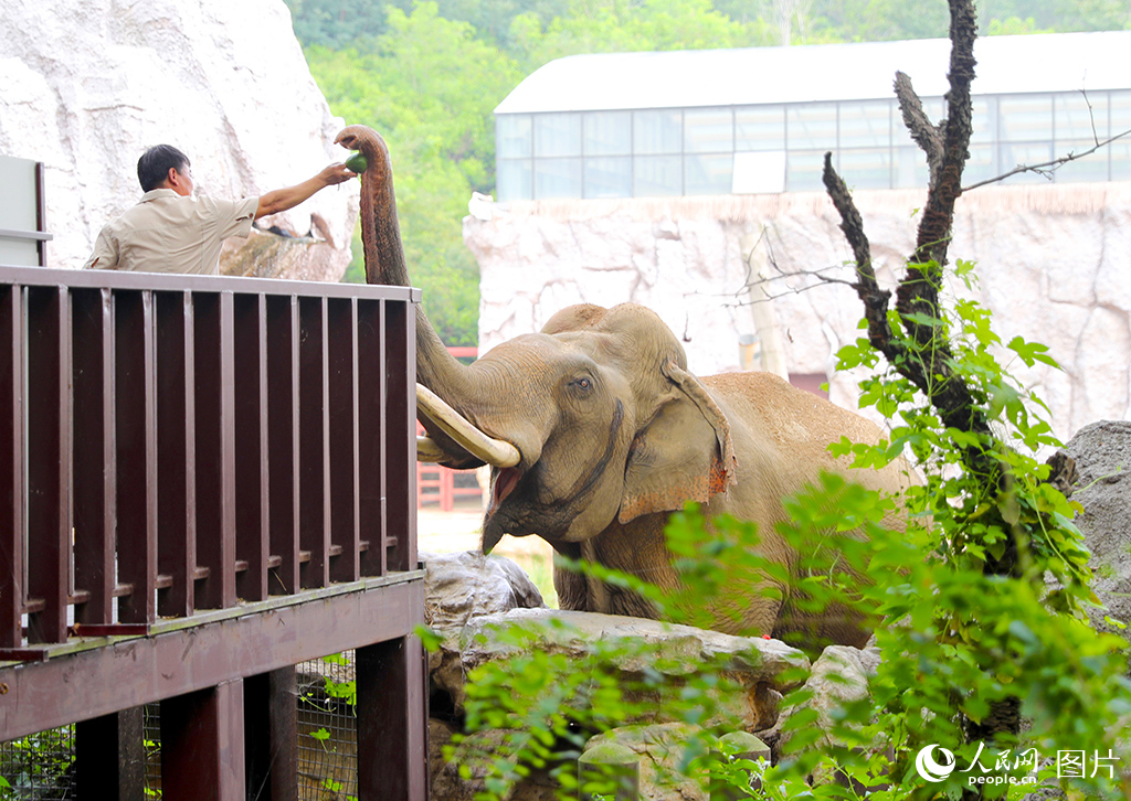 A zoo keeper feeds fruit to an elephant at Qingdao Forest Wildlife World in Qingdao city, east China's Shandong Province. (Photo/Zhang Jingang)
