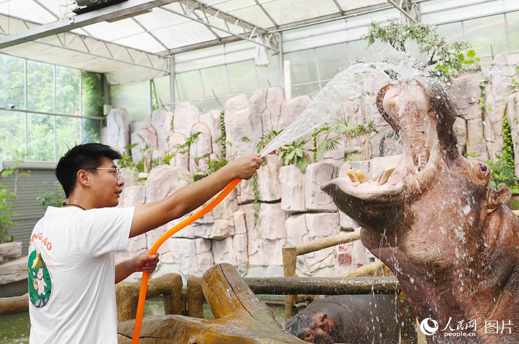 A zoo keeper sprays water on a hippo at Qingdao Forest Wildlife World in Qingdao city, east China's Shandong Province. (Photo/Zhang Jingang)