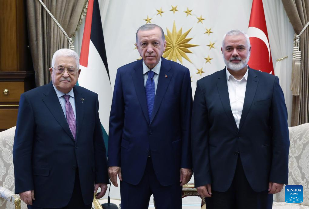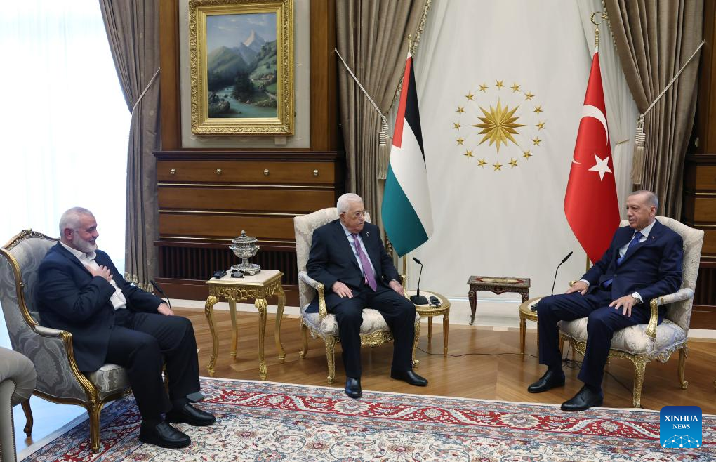 ANKARA, July 26 (Xinhua) -- Turkish President Recep Tayyip Erdogan held a meeting with Palestinian President Mahmoud Abbas and Hamas leader Ismail Haniyeh on Wednesday in the Turkish capital Ankara, the semi-official Anadolu Agency reported.