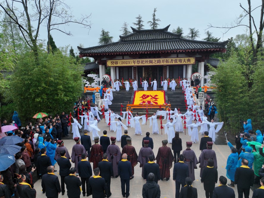 A ceremony in memory of Zhang Qian is held at the Mianxian county museum, Hanzhong, northwest China's Shaanxi province, April 3, 2023. Zhang Qian is a royal emissary in China's Han Dynasty (202 B.C.-220 A.D.) who traveled westward on a mission of peace and opened an overland route linking the East and the West. (Photo from the Publicity Department of the Communist Party of China Hanzhong Municipal Committee)