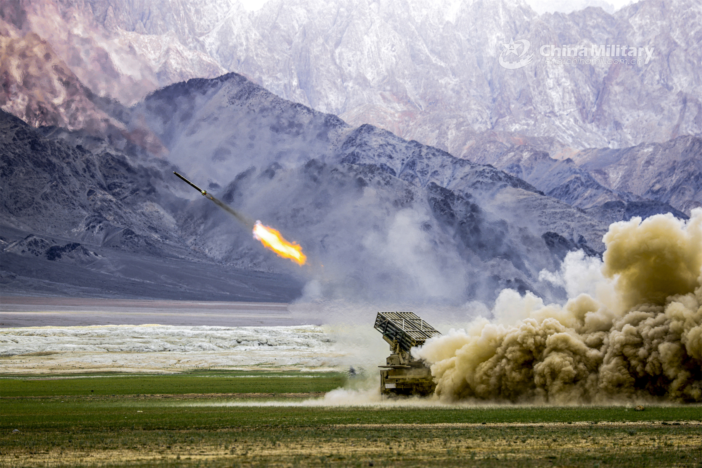 A vehicle-mounted rocket launcher attached to a unit of the PLA army fires at mock targets during a live-fire training exercise on July 13, 2023. (eng.chinamil.com.cn/Photo by Shang Luhang)