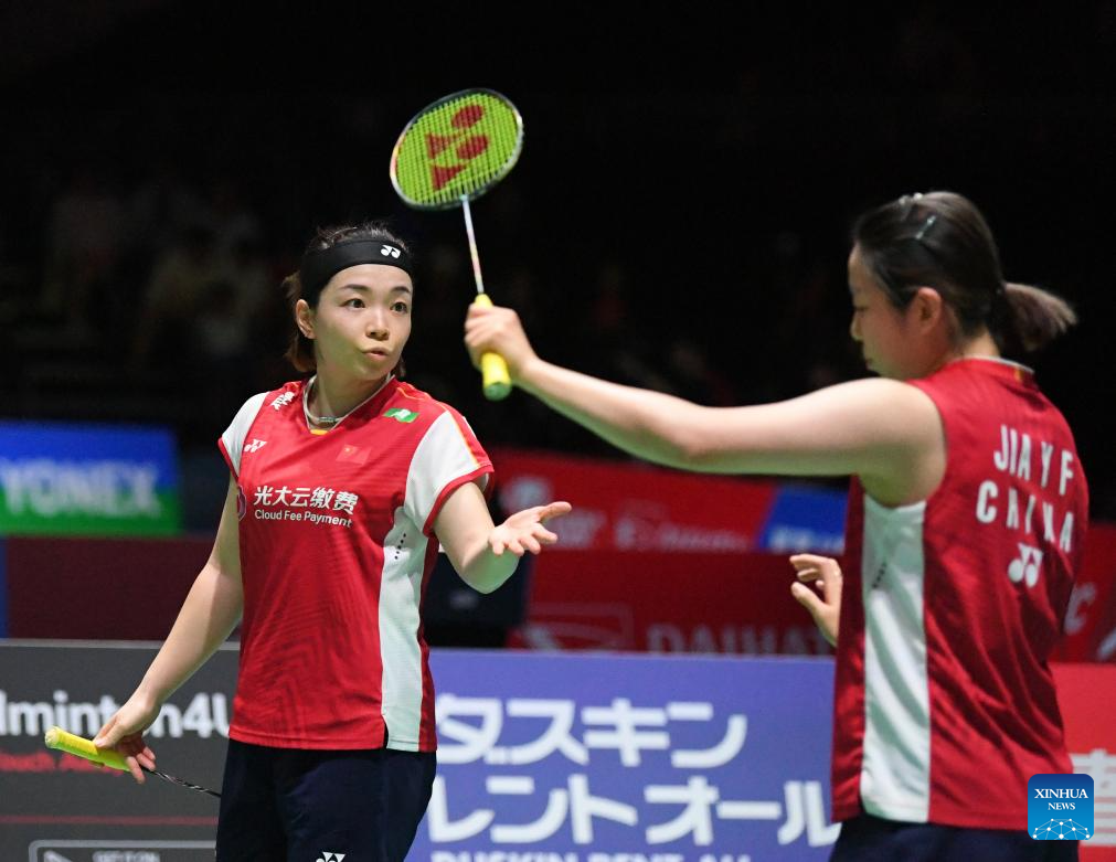 Chen Qingchen (L)/Jia Yifan of China compete during the women's doubles second round match against Pearly Tan/Thinaah Muralitharan of Malaysia at the Japan Open Badminton Championships 2023 in Tokyo, Japan, July 27, 2023. (Xinhua/Yang Guang)