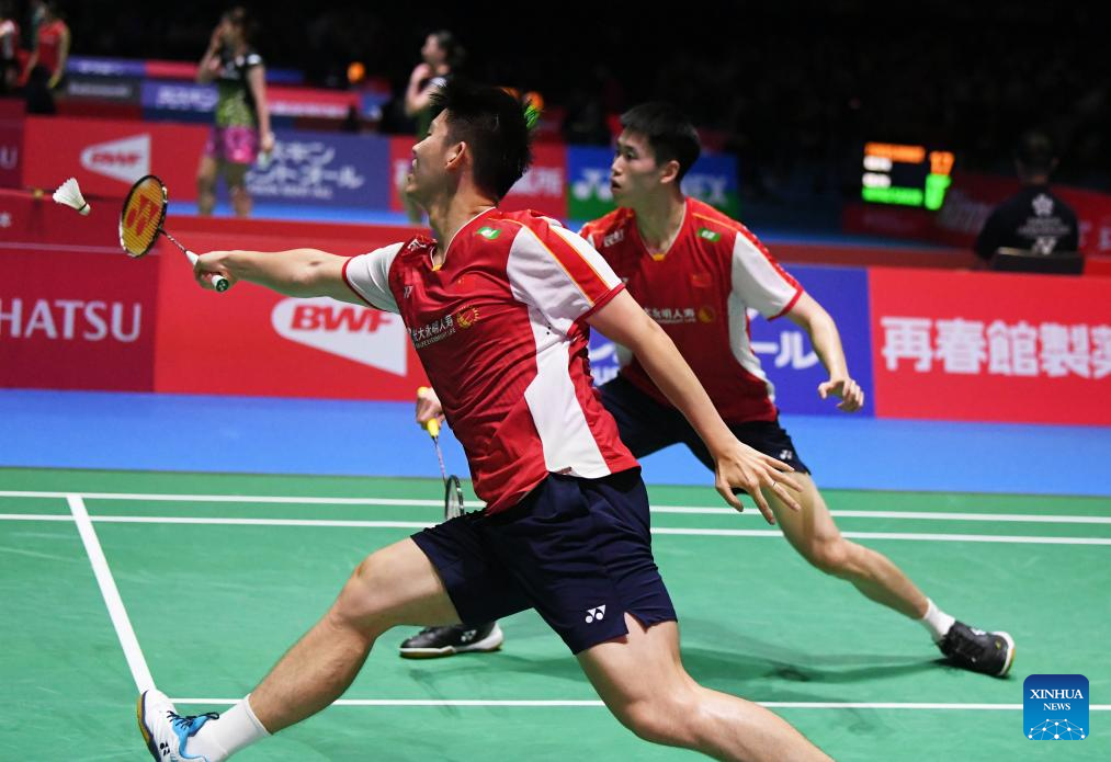 Liu Yuchen(L)/Ou Xuanyi of China compete during the men's doubles second round match against Goh Sze Fei/Nur Izzuddin of Malaysia at the Japan Open Badminton Championships 2023 in Tokyo, Japan, July 27, 2023. (Xinhua/Yang Guang)