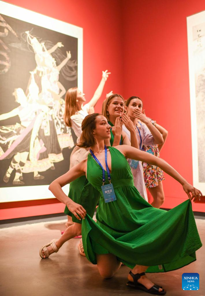 Sofia poses for photos in front of a painting at the Xinjiang Art Museum in Urumqi, capital of northwest China's Xinjiang Uygur Autonomous Region, on July 20, 2023. (Xinhua/Hu Huhu)