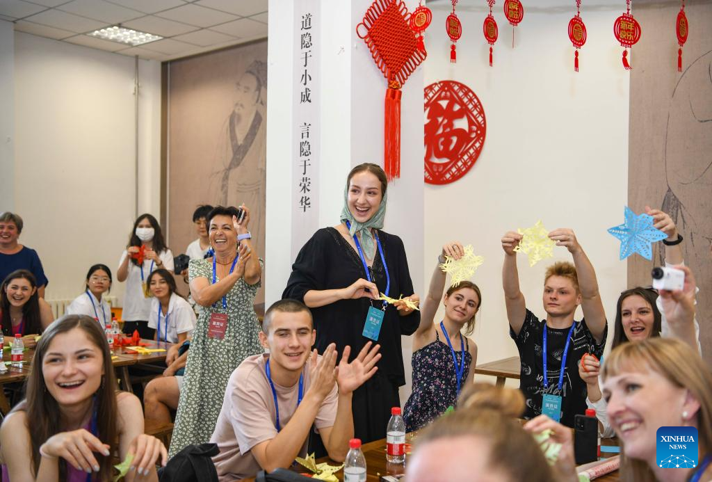 Sofia (C) learns paper-cutting at the Xinjiang Library in Urumqi, capital of northwest China's Xinjiang Uygur Autonomous Region, on July 23, 2023. (Xinhua/Hu Huhu)