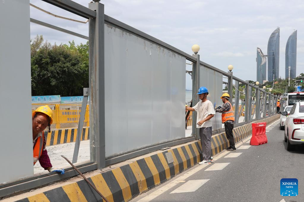 Staff members dismantle metal fences at a construction site in Xiamen, southeast China's Fujian Province, July 27, 2023.?(Photo by Zeng Demeng/Xinhua)