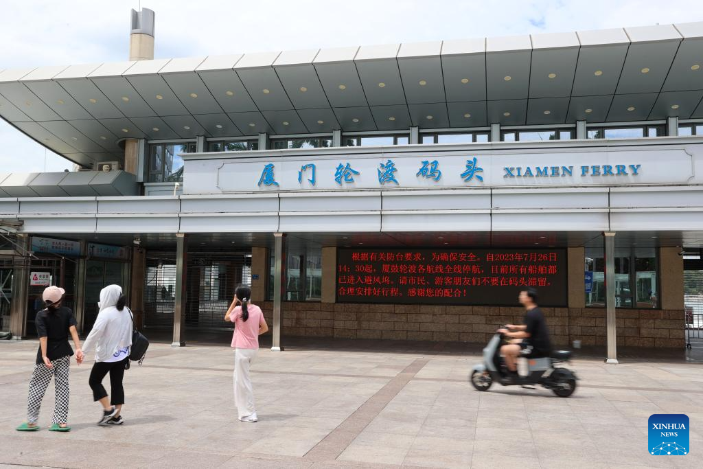 This photo taken on July 27, 2023 shows suspension information of ferry service on the screen of a dock in Xiamen, southeast China's Fujian Province.?(Photo by Zeng Demeng/Xinhua)