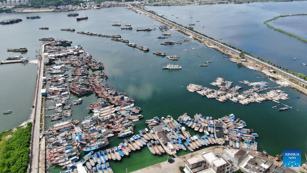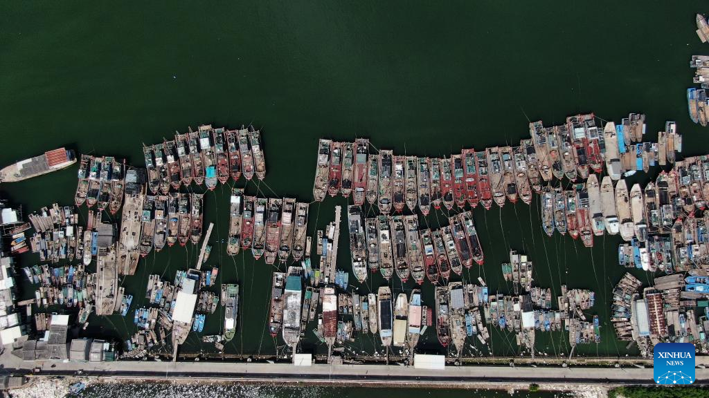 This aerial photo shows fishing boats taking shelter at a harbor as Typhoon Doksuri approaches in Chaozhou City of south China's Guangdong Province, July 27, 2023. (Xinhua/Wang Ruiping)
