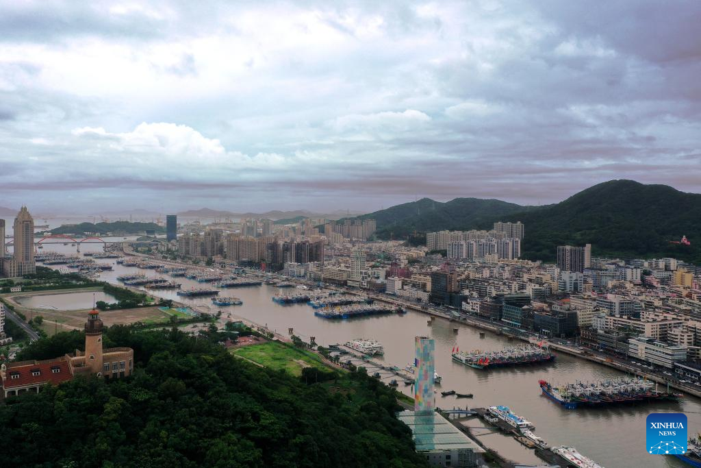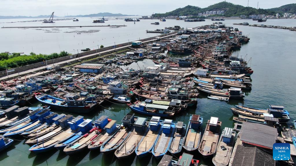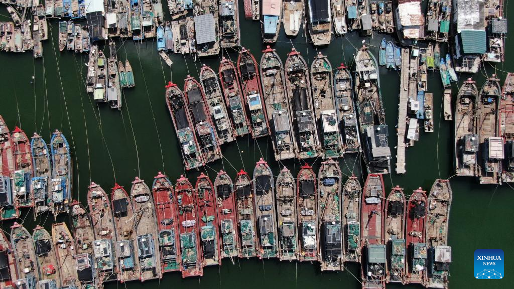 This aerial photo shows fishing boats at a dock in Xiamen, southeast China's Fujian Province, July 27, 2023.?(Photo by Zeng Demeng/Xinhua)