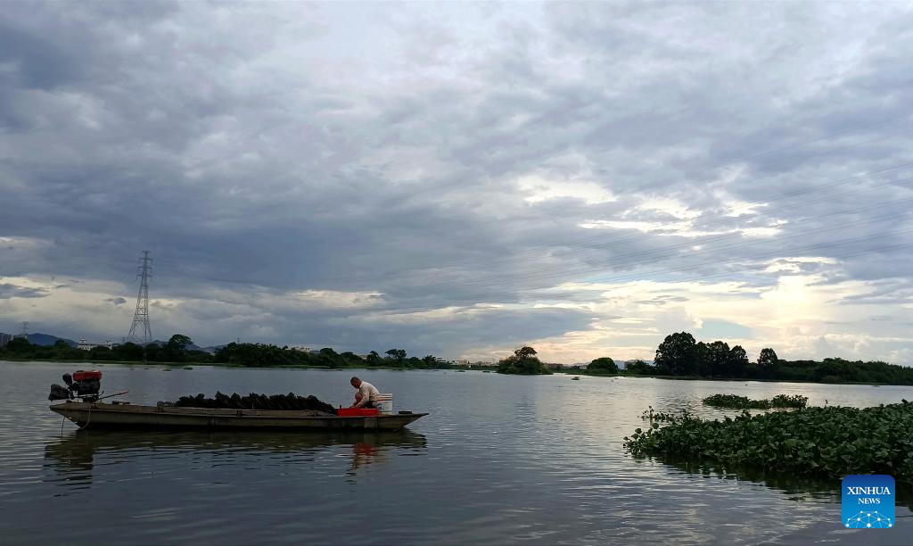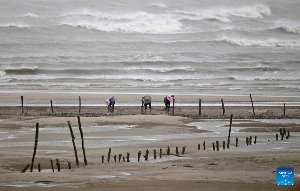 Fishermen finish off their work at the beach as Typhoon Doksuri approaches in Fuzhou, southeast China's Fujian Province, July 27, 2023. (Xinhua/Wei Peiquan)