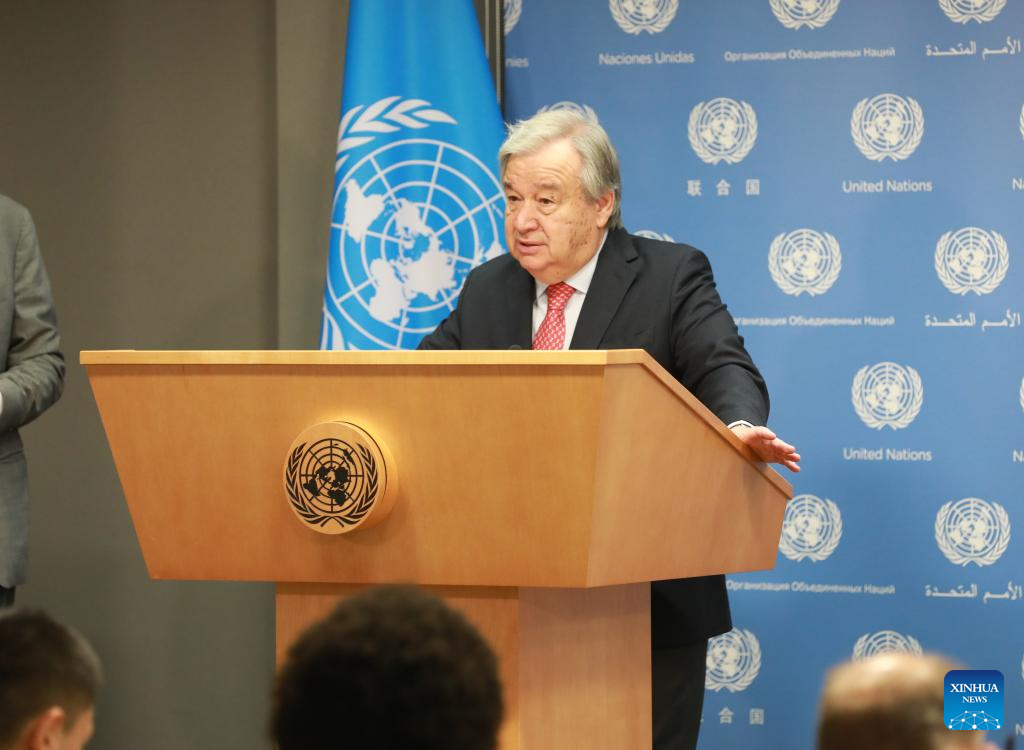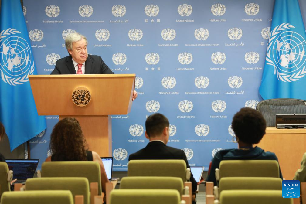 UN Secretary-General Antonio Guterres speaks at a press conference at the UN headquarters in New York, on July 27, 2023. Humanity is in the hot seat, Guterres said Thursday, underscoring the need to accelerate climate action. (Xinhua/Xie E)