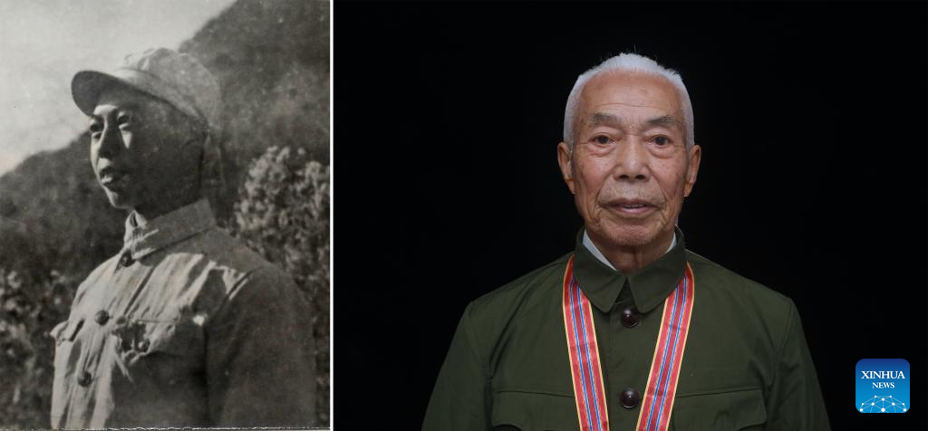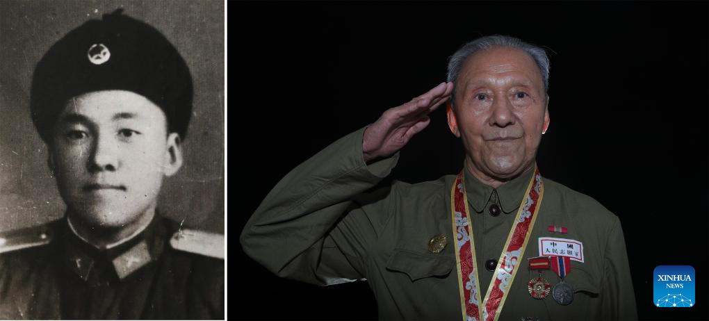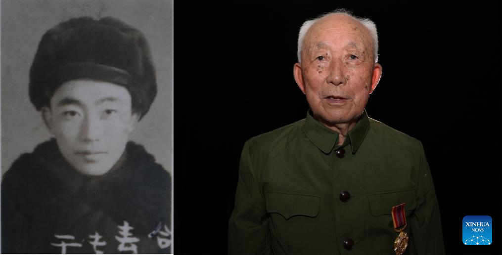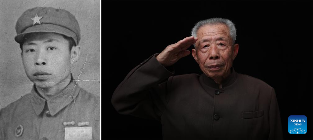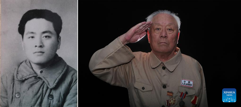 This combo photo shows the portrait of Xiang Fengyu on July 4, 2023. Born in 1933, Xiang participated in the War to Resist U.S. Aggression and Aid Korea in 1951, serving as a communication officer. (Xinhua/Yang Qing)