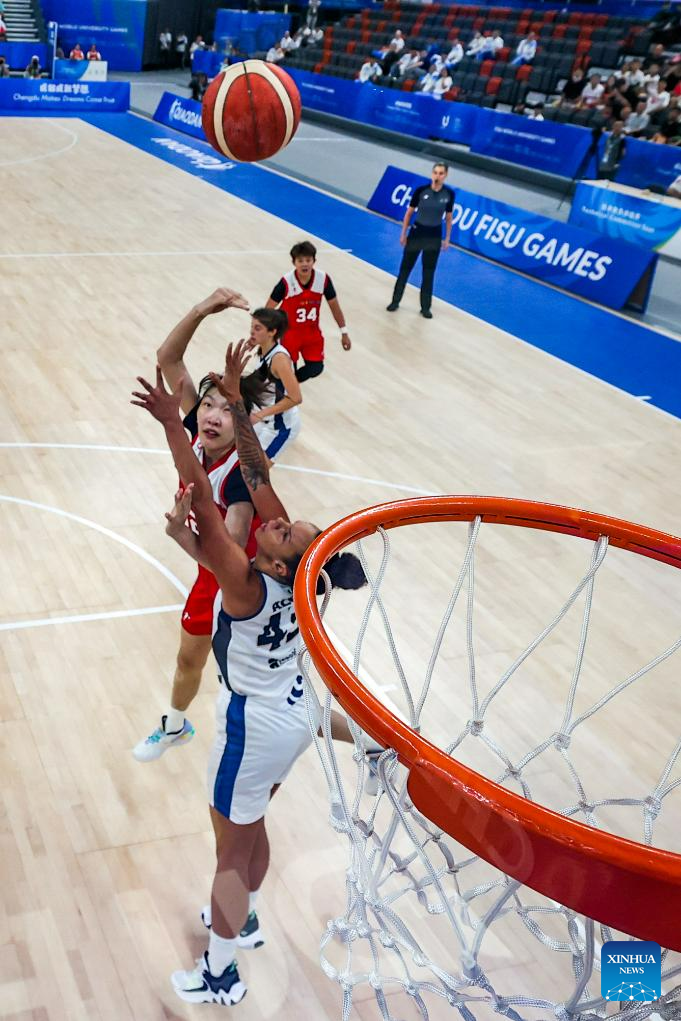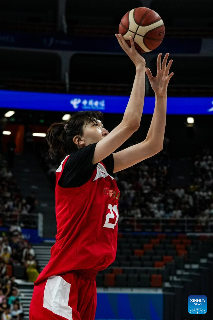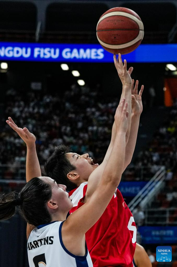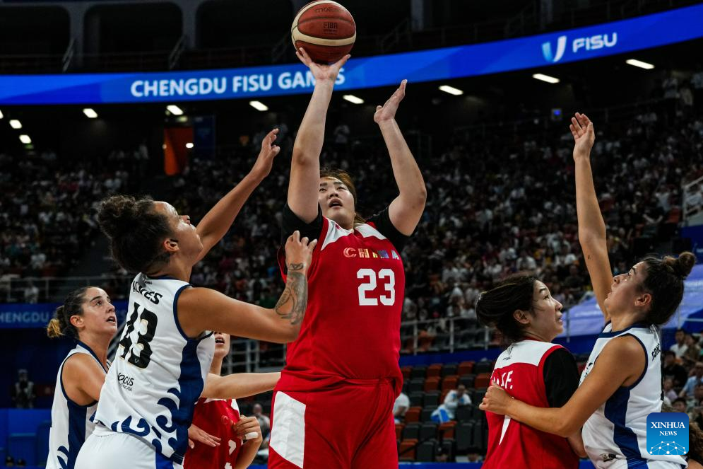 Han Xu (1st L) of China shoots during the women's basketball preliminary round group D match between China and Portugal at the 31st FISU Summer World University Games in Chengdu, southwest China's Sichuan Province, July 28, 2023. (Xinhua/Hu Chao)