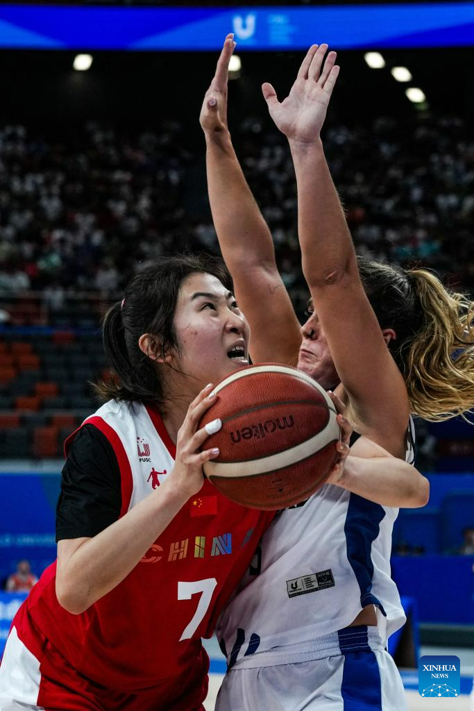 Liu Yutong (C) of China goes for a lay-up during the women's basketball preliminary round group D match between China and Portugal at the 31st FISU Summer World University Games in Chengdu, southwest China's Sichuan Province, July 28, 2023. (Xinhua/Hu Chao)