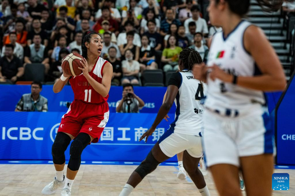 Tang Ziting (L) of China passes the ball during the women's basketball preliminary round group D match between China and Portugal at the 31st FISU Summer World University Games in Chengdu, southwest China's Sichuan Province, July 28, 2023. (Xinhua/Hu Chao)