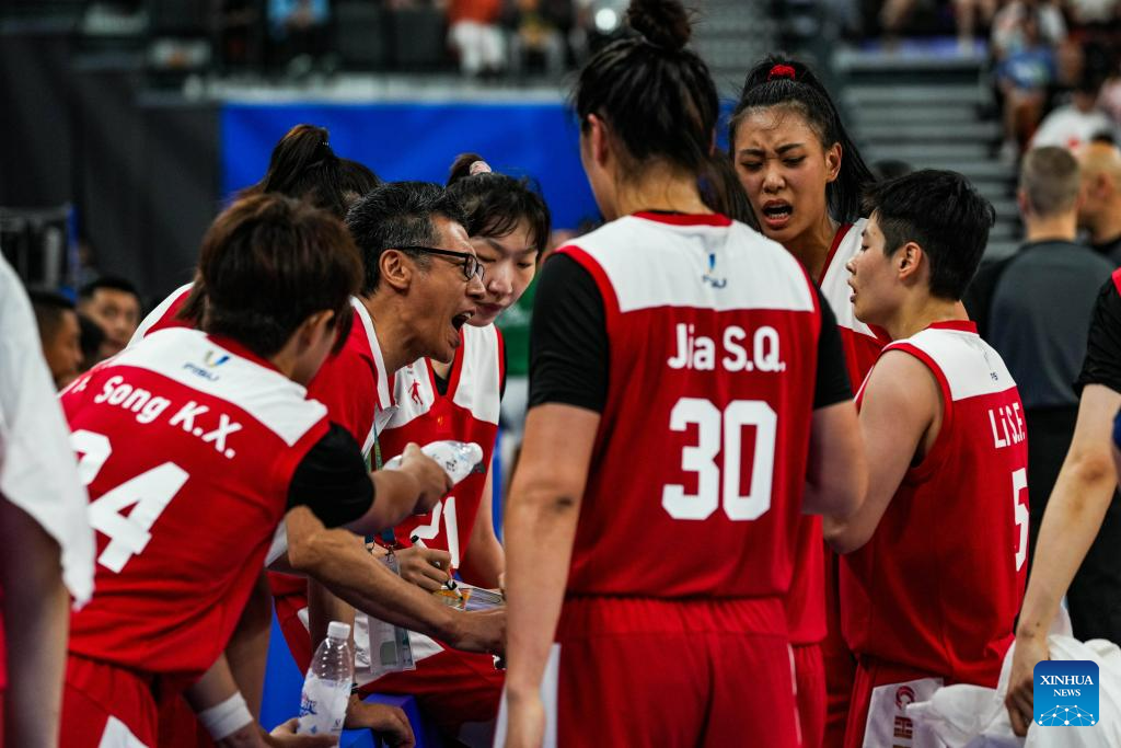 Li Sunnan (2nd L), head coach of China, gives instructions to players during the women's basketball preliminary round group D match between China and Portugal at the 31st FISU Summer World University Games in Chengdu, southwest China's Sichuan Province, July 28, 2023. (Xinhua/Hu Chao)