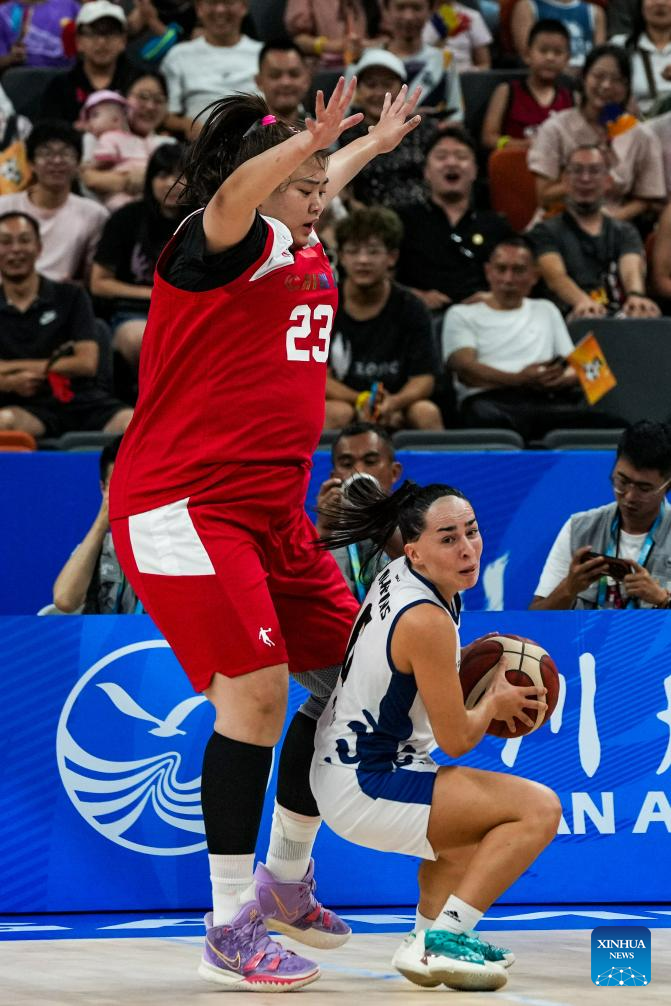 Li Yifan (R) of China defends during the women's basketball preliminary round group D match between China and Portugal at the 31st FISU Summer World University Games in Chengdu, southwest China's Sichuan Province, July 28, 2023. (Xinhua/Hu Chao)