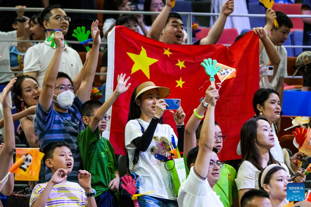 Spectators cheer after team China won the women's basketball preliminary round group D match between China and Portugal at the 31st FISU Summer World University Games in Chengdu, southwest China's Sichuan Province, July 28, 2023. (Xinhua/Hu Chao)