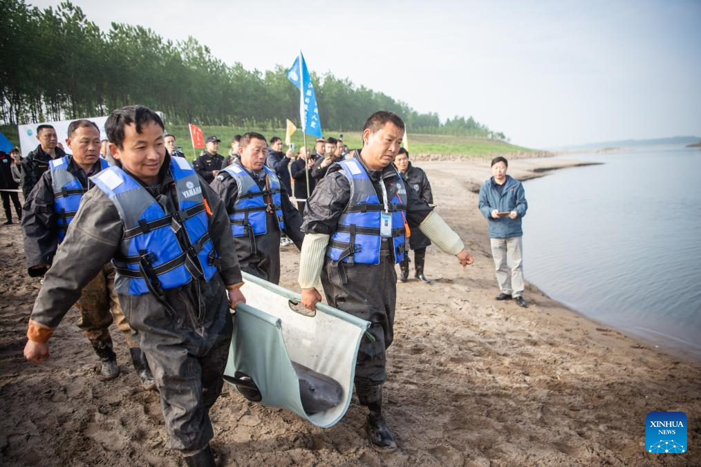 Staff members transfer Yangtze porpoises to a section of Yangtze River and release them there in central China's Hubei Province, on April 25, 2023. (Xinhua/Wu Zhizun)