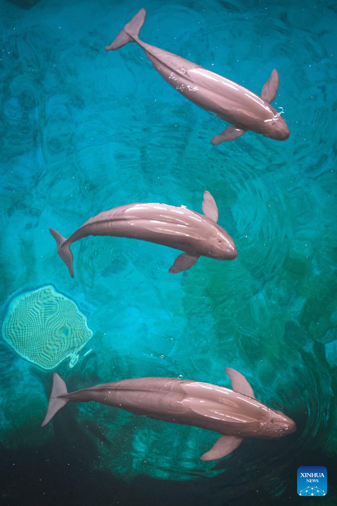 Three Yangtze finless porpoises swim at the Baiji Dolphin House under the Institute of Hydrobiology, the Chinese Academy of Sciences (CAS) in Wuhan, central China's Hubei Province, June 29, 2023. (Xinhua/Xiao Yijiu)