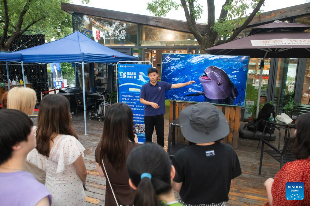 He Junyi, a science popularization lecturer, gives a lecture on Yangtze finless porpoise protection at the Hankou marshland by the Yangtze River in Wuhan, central China's Hubei Province, June 28, 2023. (Xinhua/Xiao Yijiu)