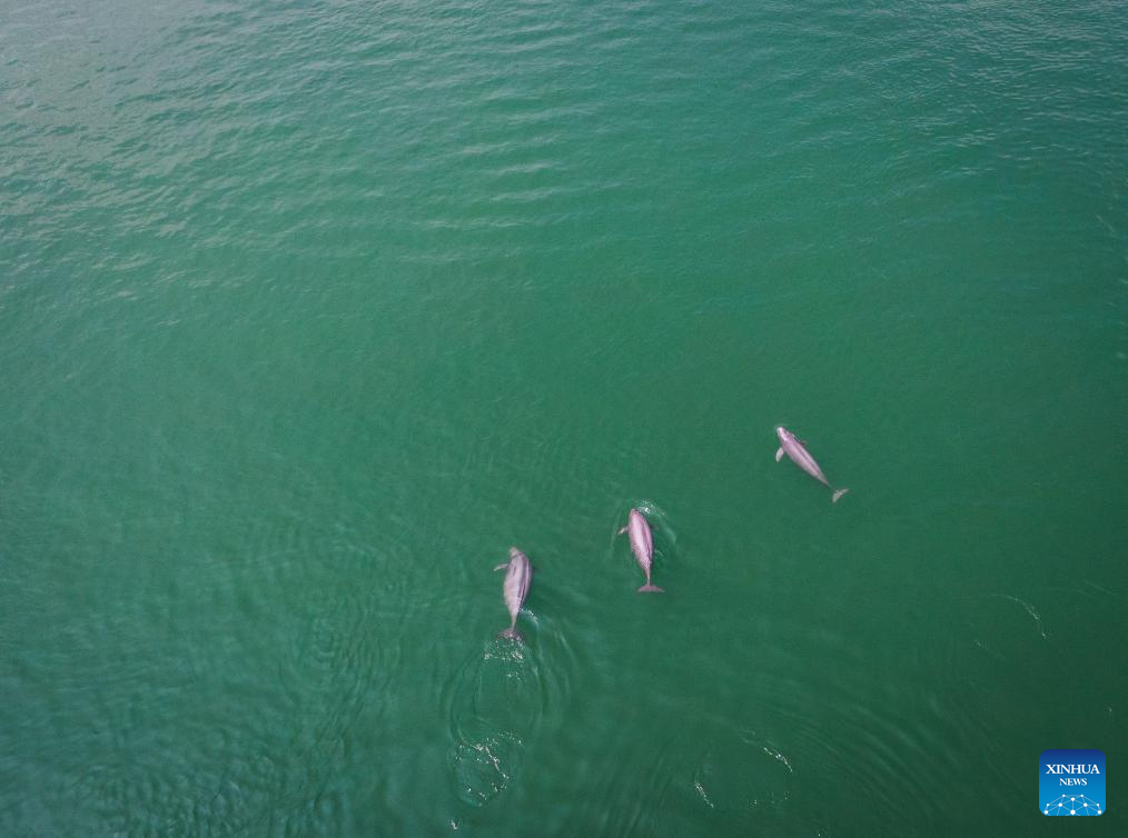 This aerial photo taken on May 11, 2021 shows three Yangtze finless porpoises swimming in the section of Yangtze River in Yichang, central China's Hubei Province. (Xinhua/Xiao Yijiu)