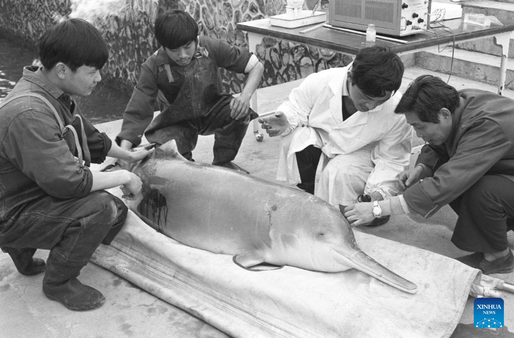 This file photo taken in the 1980s shows researchers of the Baiji dolphin research group under the Institute of Hydrobiology, the Chinese Academy of Sciences examining Baiji dolphin Qi Qi. (Xinhua/Yu Chengjian)