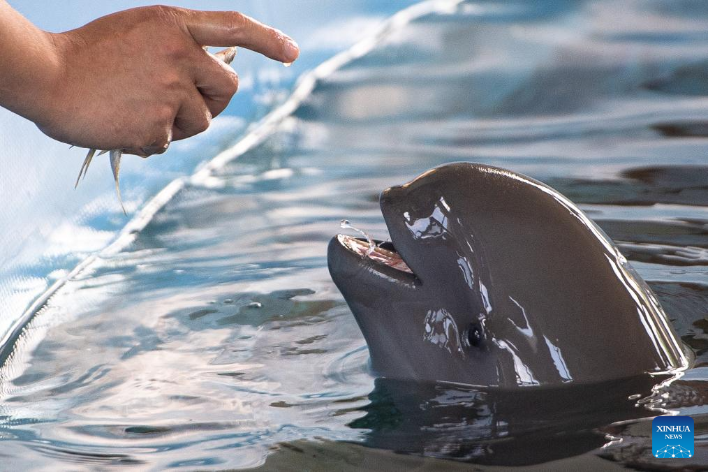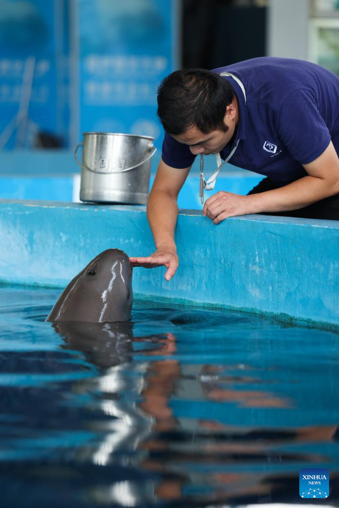 A trainer feeds baby finless porpoise F9C22 at the Baiji Dolphin House under the Institute of Hydrobiology, the Chinese Academy of Sciences in Wuhan, central China's Hubei Province, July 5, 2023. (Xinhua/Xiao Yijiu)