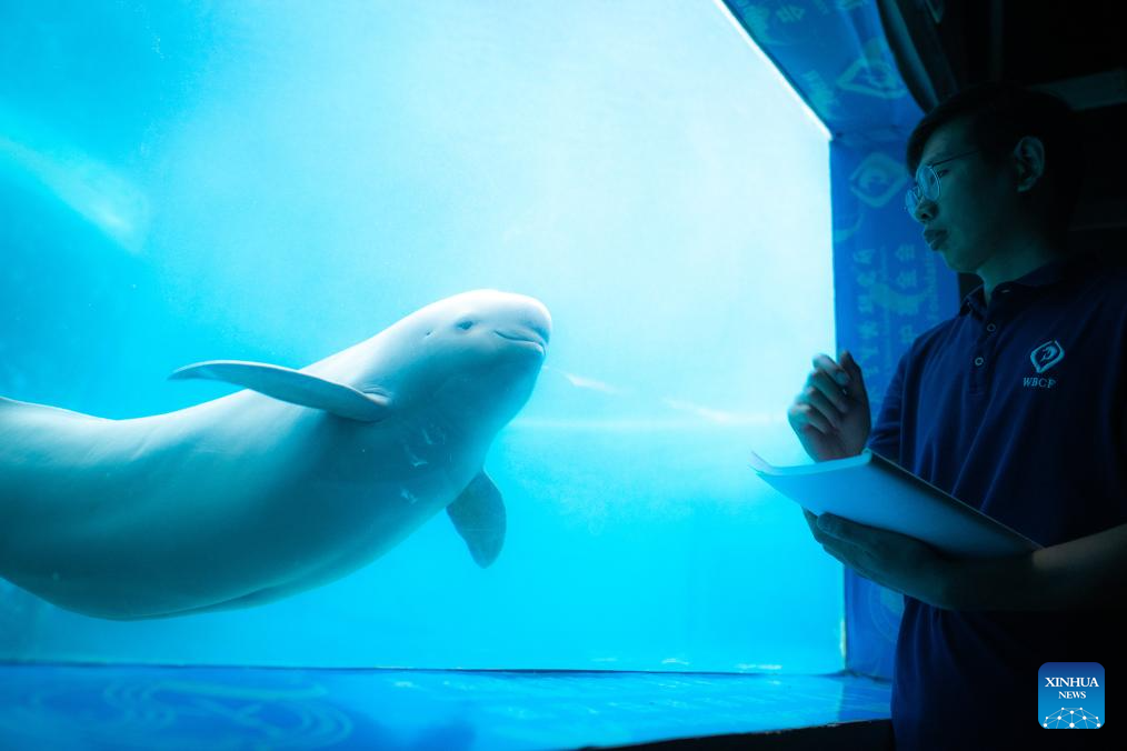 Trainer Deng Zhengyu observes a Yangtze finless porpoise at the Baiji Dolphin House under the Institute of Hydrobiology, the Chinese Academy of Sciences in Wuhan, central China's Hubei Province, on July 5, 2023. (Xinhua/Xiao Yijiu)