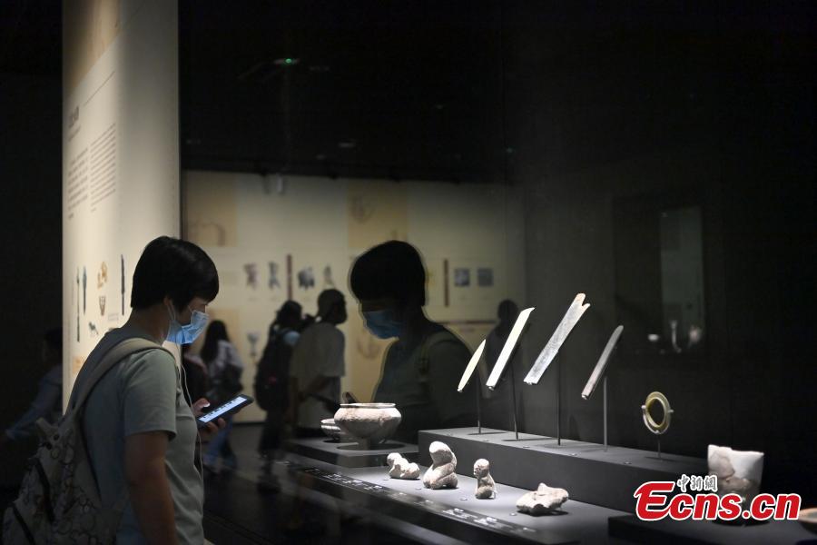 Visitors view cultural relics exhibited at the new building of the Sanxingdui Museum in Guanghan, southwest China's Sichuan Province, July 27, 2023. (Photo: China News Service/An Yuan)