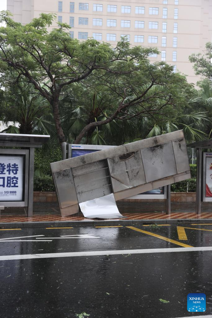 A bus station damaged by wind is pictured in Siming District of Xiamen, southeast China's Fujian Province, July 28, 2023. Typhoon Doksuri, the fifth typhoon of this year, made landfall in east China's Fujian Province on Friday morning, bringing with it powerful winds and heavy rain. (Photo by Zeng Demeng/Xinhua)