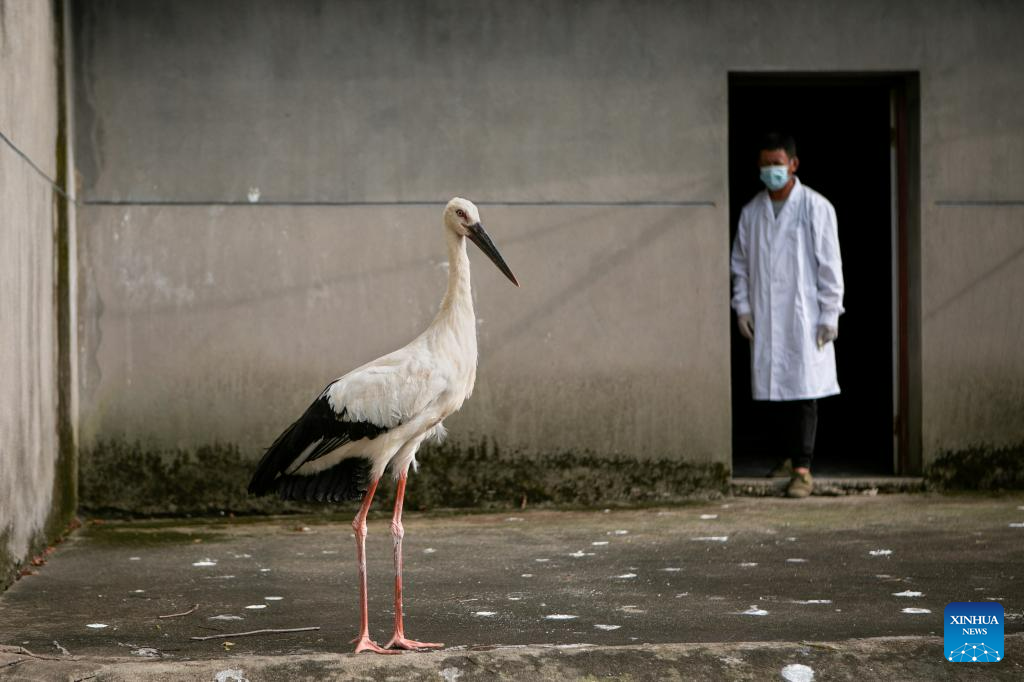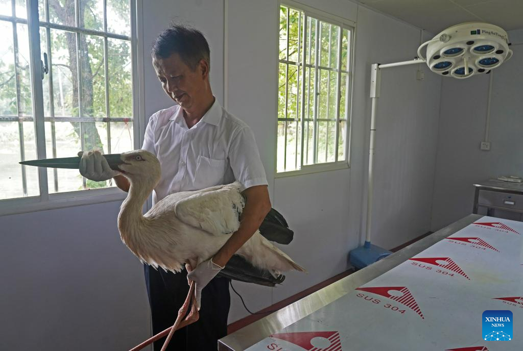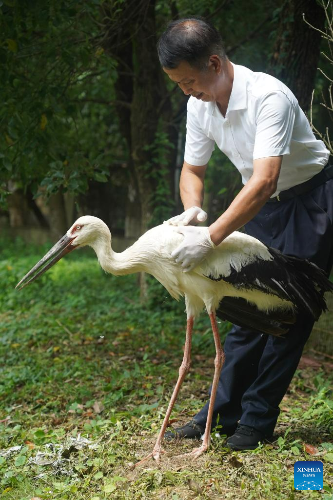 A staff member takes care of an oriental white stork in a protection station of the Poyang Lake National Nature Reserve in Yongxiu County, east China's Jiangxi Province, July 15, 2023. Staff members composed of rescuers, doctors, patrolmen and police officers in the protection station of Poyang Lake National Nature Reserve and the Wildlife Rescue and Breeding Center of Jiangxi Province rescue injured migratory birds and help them return to the wild. (Xinhua/Wan Xiang)