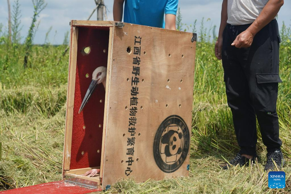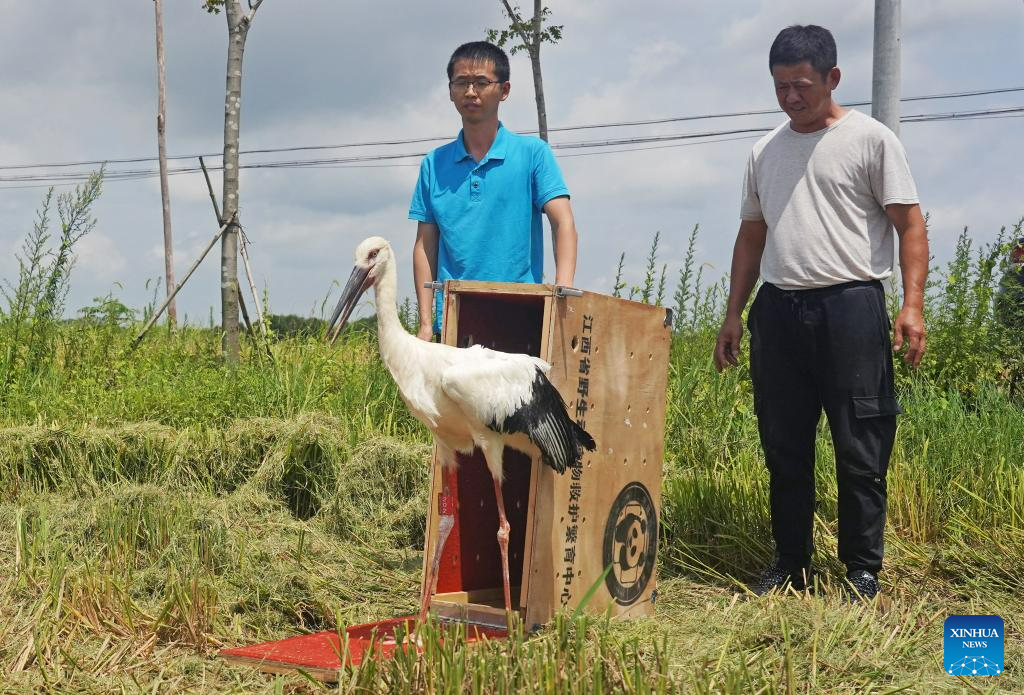 A cured oriental white stork rescued by the Wildlife Rescue and Breeding Center of Jiangxi Province is released into the wild in Jinxian County, east China's Jiangxi Province, July 20, 2023. Staff members composed of rescuers, doctors, patrolmen and police officers in the protection station of Poyang Lake National Nature Reserve and the Wildlife Rescue and Breeding Center of Jiangxi Province rescue injured migratory birds and help them return to the wild. (Xinhua/Wan Xiang)