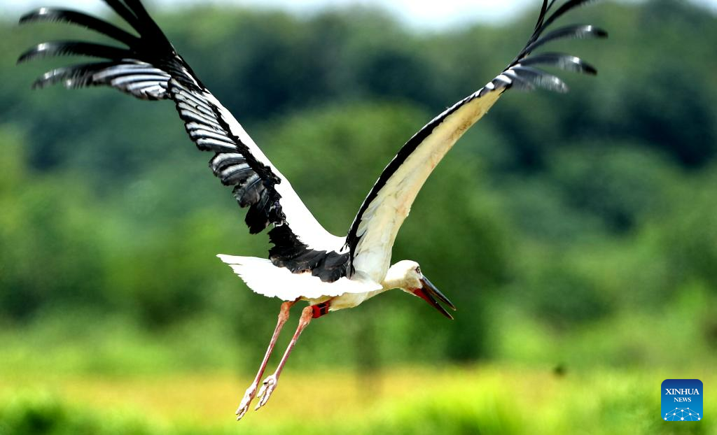 A cured oriental white stork rescued by the Wildlife Rescue and Breeding Center of Jiangxi Province flies to the field in Jinxian County, east China's Jiangxi Province, July 20, 2023. Staff members composed of rescuers, doctors, patrolmen and police officers in the protection station of Poyang Lake National Nature Reserve and the Wildlife Rescue and Breeding Center of Jiangxi Province rescue injured migratory birds and help them return to the wild. (Xinhua/Wan Xiang)