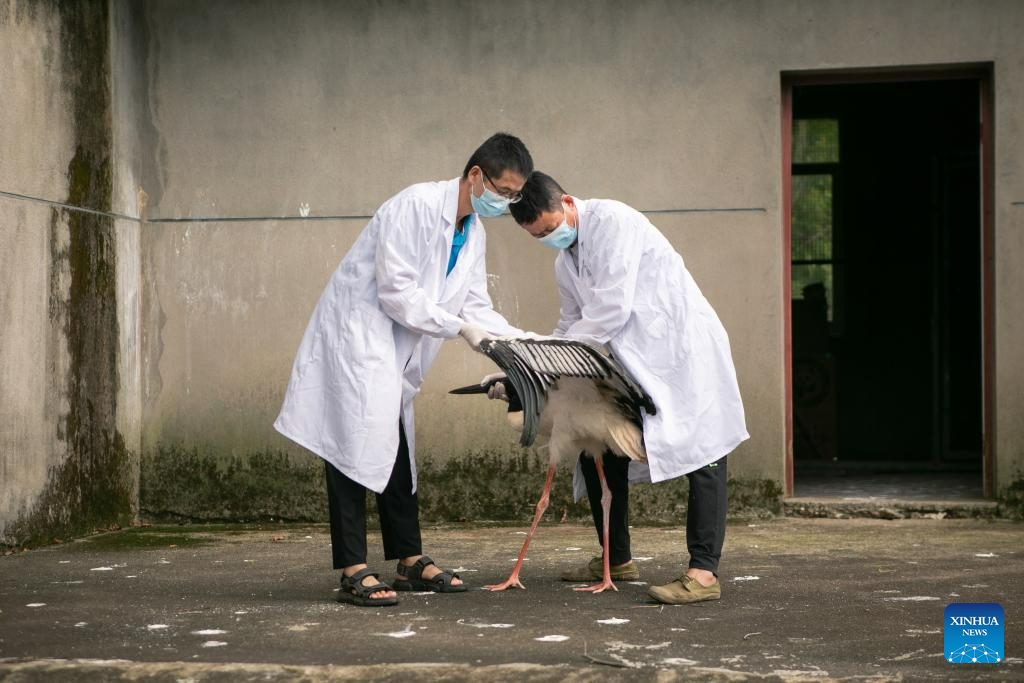 A staff member checks the condition of an oriental white stork in the Wildlife Rescue and Breeding Center of Jiangxi Province in Nanchang, east China's Jiangxi Province, July 16, 2023. Staff members composed of rescuers, doctors, patrolmen and police officers in the protection station of Poyang Lake National Nature Reserve and the Wildlife Rescue and Breeding Center of Jiangxi Province rescue injured migratory birds and help them return to the wild. (Xinhua/Jin Liwang)