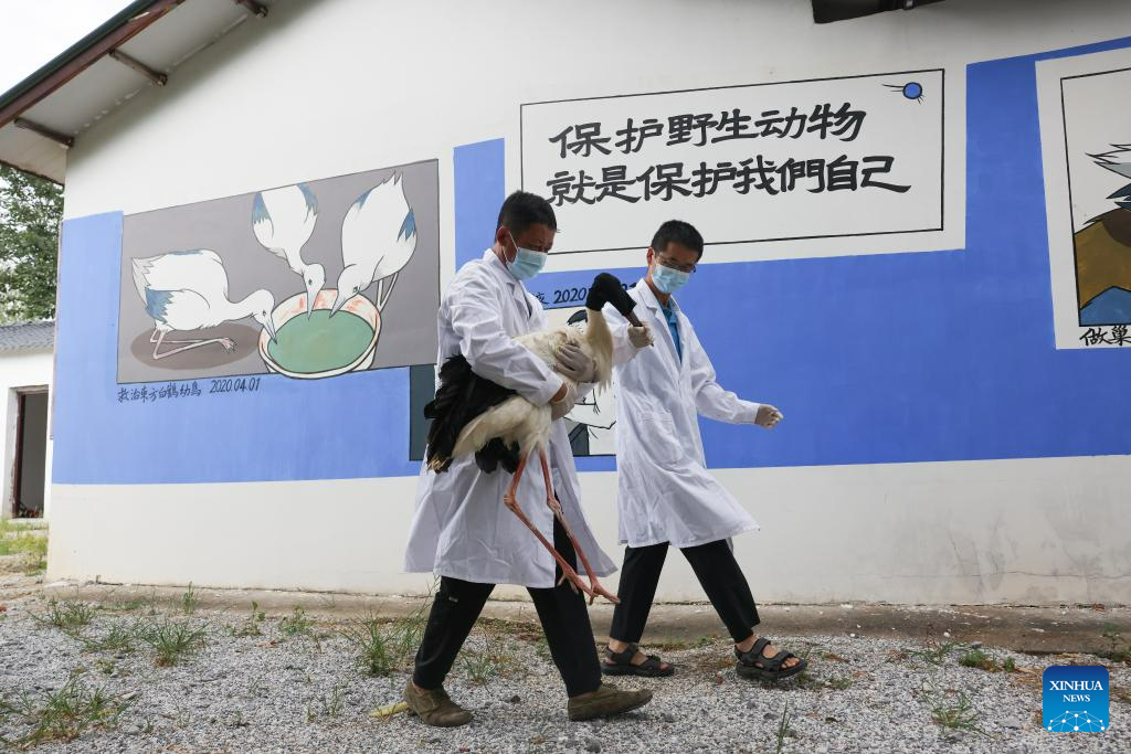 Staff members carry an oriental white stork after checking its condition in the Wildlife Rescue and Breeding Center of Jiangxi Province in Nanchang, east China's Jiangxi Province, July 16, 2023. Staff members composed of rescuers, doctors, patrolmen and police officers in the protection station of Poyang Lake National Nature Reserve and the Wildlife Rescue and Breeding Center of Jiangxi Province rescue injured migratory birds and help them return to the wild. (Xinhua/Jin Liwang)